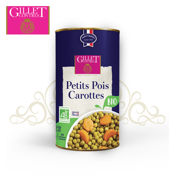 Petits pois* origine France, eau, carottes rondelles* origine France, sel de mer.