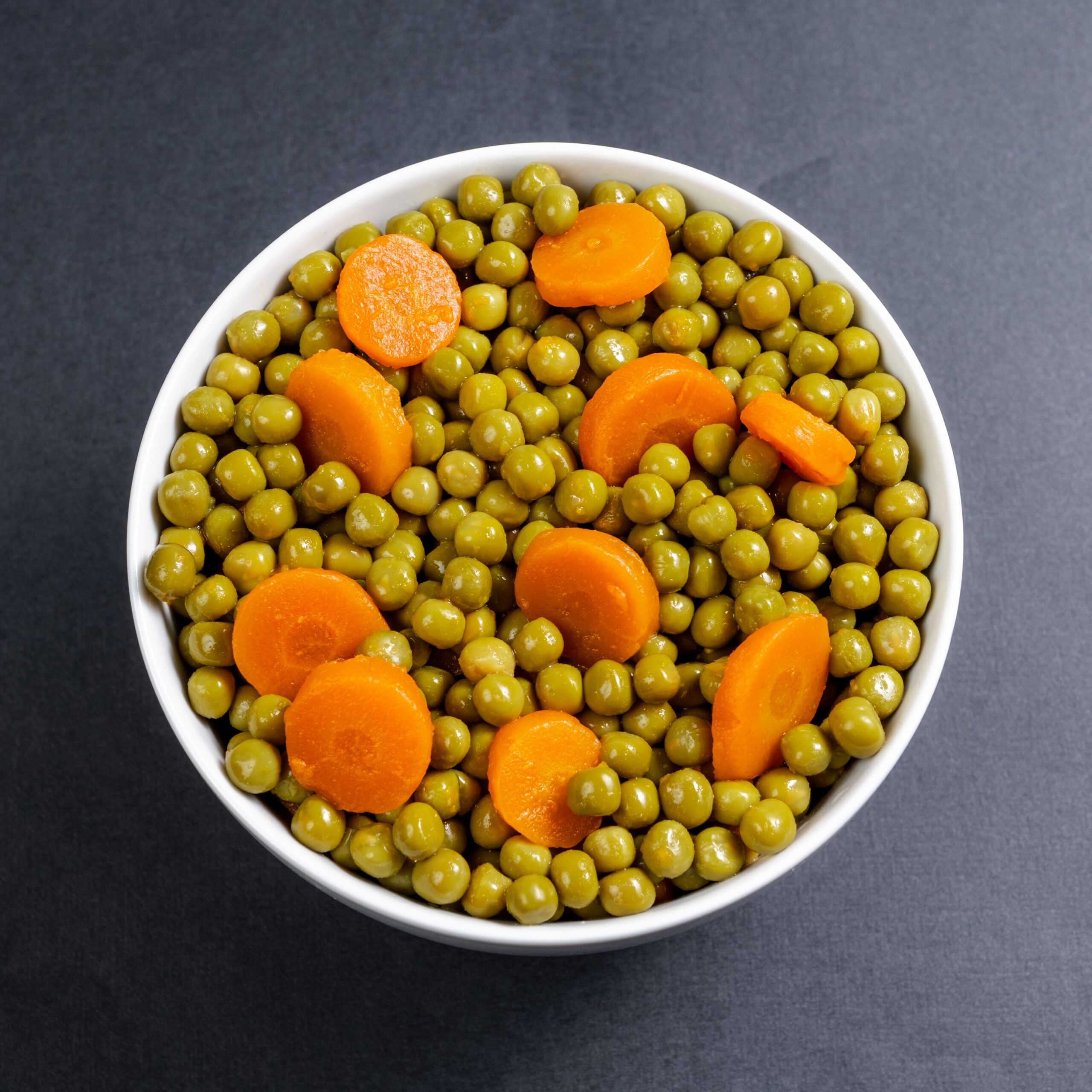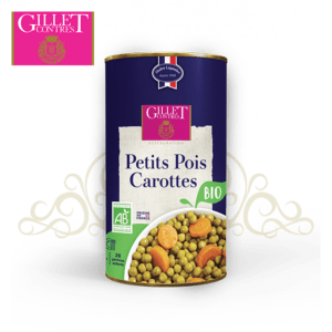 Petits pois* origine France, eau, carottes rondelles* origine France, sel de mer.